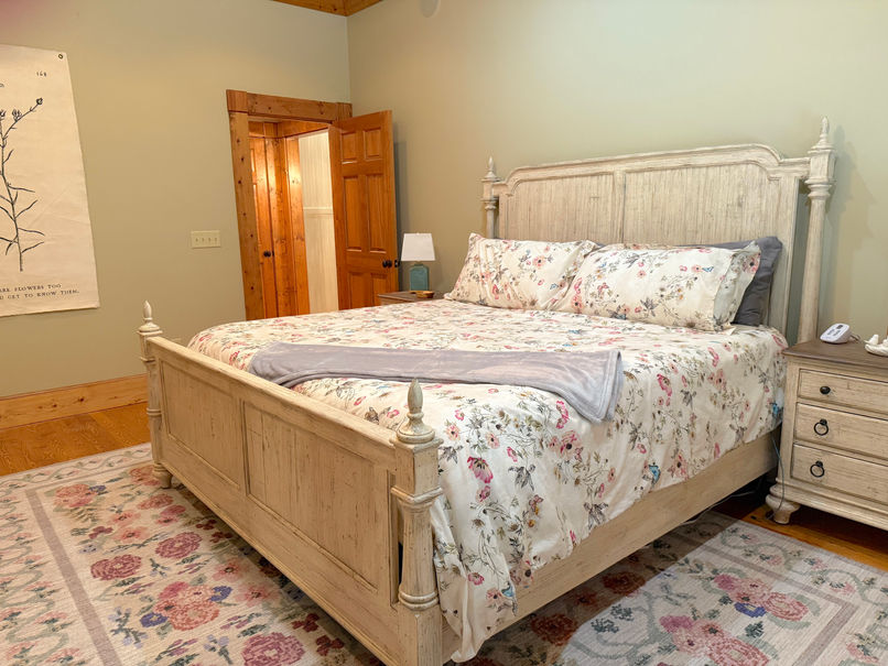 The house is nestled into over 5 wooded acres, so the rocking chair front porch and back patio are both wonderfully private outdoor spaces to enjoy the cool mountain air.